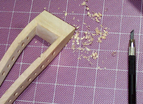 細部はデザインナイフを使ってもいいでしょう。おおむねのペグ径にしておくためにここまできたらペグリーマを使ってテーパをつけて削ります。