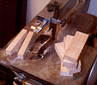 ペグ用の木材についてはこのコーナーのはじめに紹介してありますが、リンゴや洋ナシといったフルーツウッド、またはツゲを準備します。メイプルはペグには使われません。アメリカでは万年筆やボールペンを自作するホビーが市民権を得ておりまして、ペン用のペア材(22mm角材)が容易に入手できます。手頃なサイズが入手できない場合はどうするか..........そうです、泣きながらノコで切ればいいのです。この角材の時点で断面にバツ印を記しておき、中心点(回転させるときの軸)を明らかにしておきます。