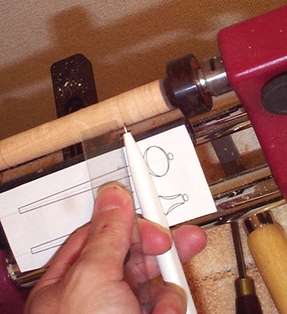さて、材料を固定して切削の準備です。図面からコピーしたペグをテンプレート代わりに使って削りのこまかい位置(間隔)をマークしていきます。このとき可能ならゆっくり旋盤を回転させます。