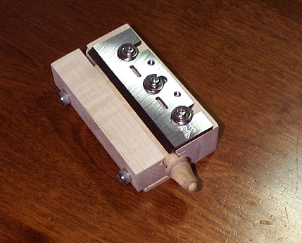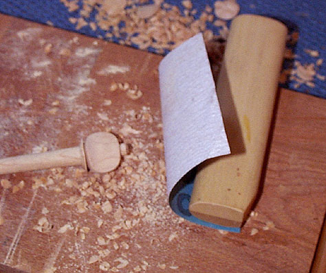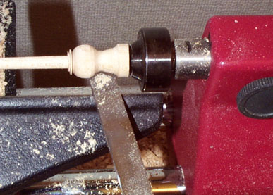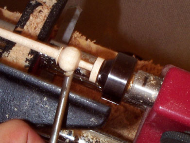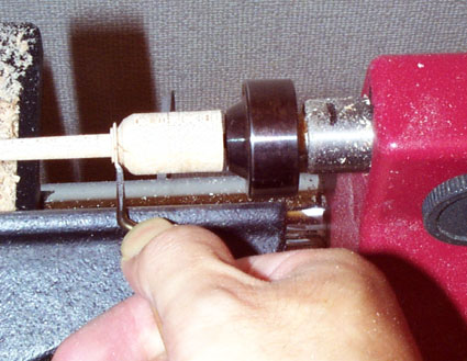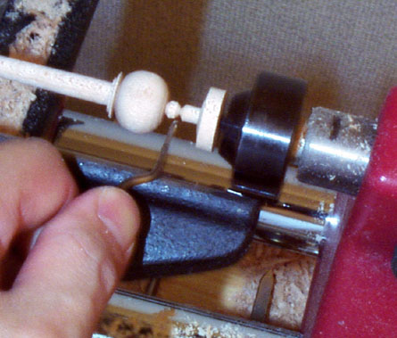 はじめに巻軸の最も太い部分を約7.5mmに最も細い部分を1:30のテーパで計算して軸の長さに相当する部分で合わせます。そしてツマミ部分の切削にはいります。木工旋盤については当クレーンホームページの弦楽器製作工具のコーナーにも書いておきましたので参考にしてください。