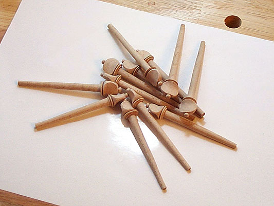 さてギターやヴァイオリン製作ではペグ(糸巻き)の入手は容易なため既製品で済ませる場合がほとんどのようですがリュートの場合はたいてい木片から木工旋盤で削り出すことが多いです。ここではその手順について説明します。