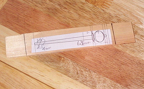 実際のテンプレートは以下の写真のように具体的な寸法を記入して、なおかつ垂直線を入れておけば使いやすいです。ペグはたいてい1:30のテーパがついていますのでリーマもペグシェーパも同じテーパのものを準備します。