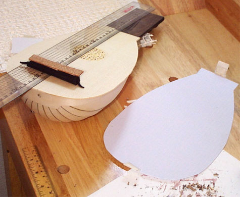 バー接着作業で表面板に貼っていた保護厚紙をはがします。そしてブリッジ位置を決定してエンピツで軽くマークをつけておきます。