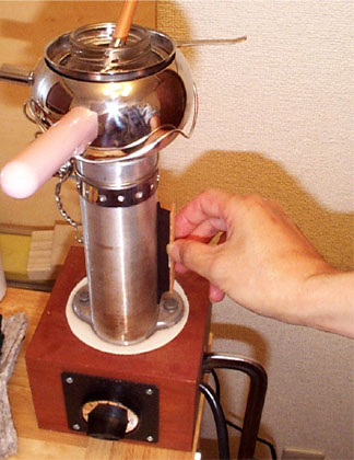 ニカワは戻したり加熱したりで何回かは使用できるものなのですが、次第に性能は落ちてくるようですからさすがにブリッジ接着時には新しいニカワを使います。表面板とブリッジの接着面を濡らして絞ったタオルできれいにしておき、ブリッジはこのように温めておきます。熱〜〜〜〜〜くなったらニカワを塗布し、表面板に密着させ上下に2mmぐらいづつズリズリとずらしてニカワをなじませ堅くなってきたら所定の位置で動きを止めてしばらくじ〜〜〜〜〜〜〜っとしておきます。もう写真を撮影している余裕などありません(笑)、このときばかりは緊張します。