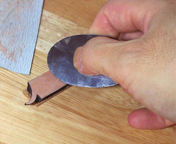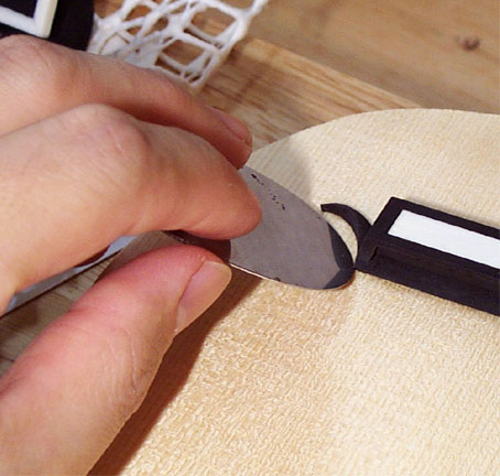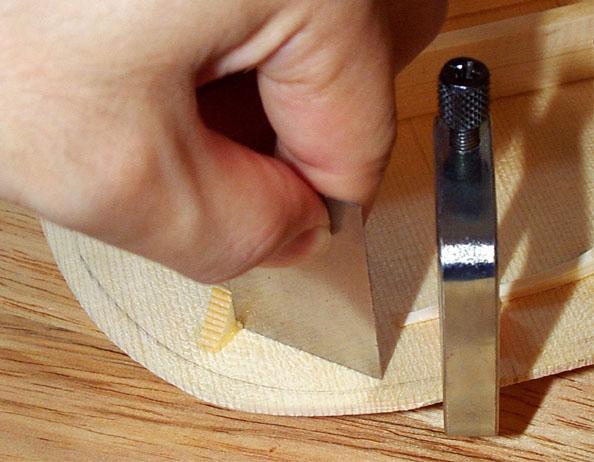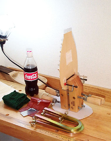 さて、問題のブリッジの接着です。接着面は丸いスクレーパを使ってわずかに窪みをつけます。ここにニカワが薄く溜まり接着を確実なものとします。これをやらずに接着すると悲劇が待っています...。