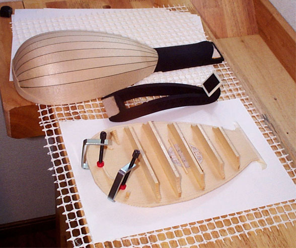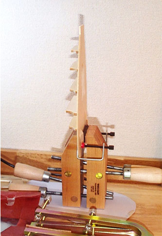 さて、ブリッジが接着されたら今度はモロモロの小さなバーを接着します。小さくても私はクランプを使います。あ、Jバーは先にも説明したようにリブに接するようにしたほうがモアベタね(小森のおばちゃま風)。というより、リブに接していたほうが音が締まってよろしいのだそうです。