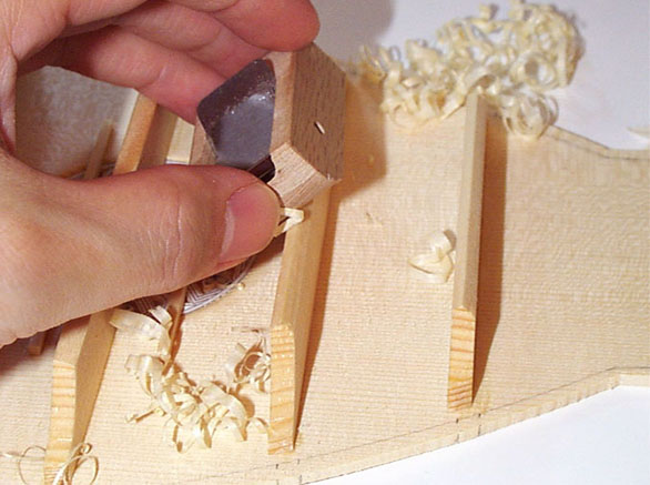 ミニカンナを使ってバーを削ります。ギターと違ってあとから手直しするのは困難です。木目の方向に注目。