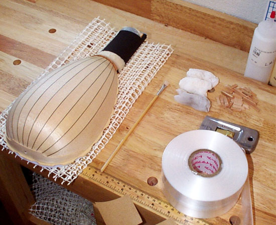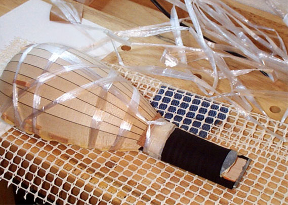 えいやっ! というわけでニカワを小筆でトフトフと塗布して素早く巻き上げます。接着するまえに濡らして絞ったタオルで接着面をきれいに拭いておいたほうがいいでしょう。巻きはじめはネックから....そして対角に巻きながら最後はやはりネックに巻きつけて固定します。もちろん写真を撮影しているバヤイではないのです、私も目が真剣です、ホラ! @_@