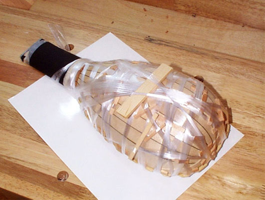 さて、ヒモ、ヒモ、ヒモ、ヒモ.............ん?..........ないっ?! う〜〜〜〜ん困った、ヒモが無いぞい! さんざん探したあげく荷造り用のビニル紐が出てきました(笑)。みなさんは「こんなんでうまくいくんかいな?」と思われるかもしれませんが、天災、いや、天災、おっと、天才製作家は筆を選ばずぢゃっ!(いつから天才製作家になったのよ?)