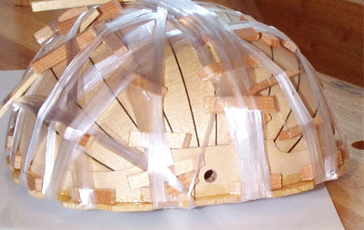 ニカワはすぐに乾きはじめるので、準備段階で作った木片を手早くブスブスと挿していきます。巻き終えて接着面を見るとややニカワ層が厚めに見えたのであせりましたが、この木片を挿すことで完全に密着できました。リュート族の楽器はまるっこいボデイ形状なのでこれにヒモをかけるのは容易ではありません。麻ヒモのほうが滑りにくいのですが今回は準備で施しておいた爪欠きがうまいぐあいに作業を助けてくれました。以下の写真の左端を見ればわかるようにリブと表面板の接合部には必ず1個の木片を挟みます、そうしないとヒモの張力でリブの角度が変わってゆがむ恐れがあるからです。