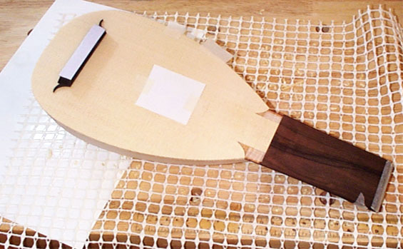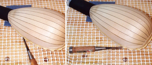 完成を急がず、あわてず、じっくり作業します。ルネサンスリュートはこれでボデイ加工は完成で、ビンディングを付けないのが普通ですが、バロック期のリュートではハーフビンディングを付けることが多く、その作業については引き続きこのあとに説明しましょう。