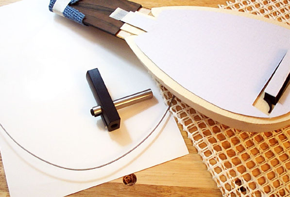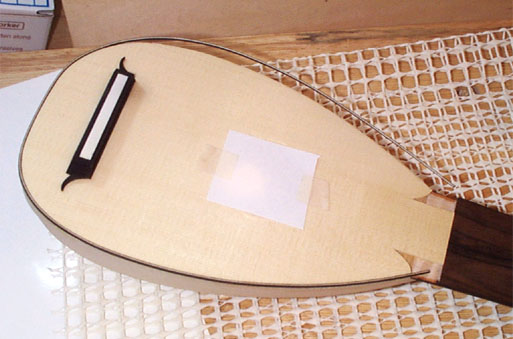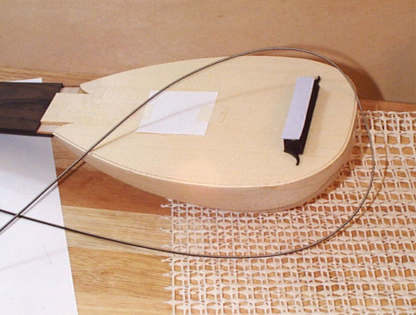 これは小さい楽器なので1本で長さは足りますが大きなリュートでは中央から左右に2本のビンディング材で巻きます。