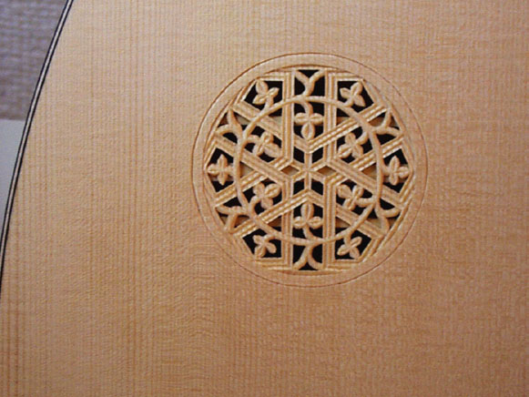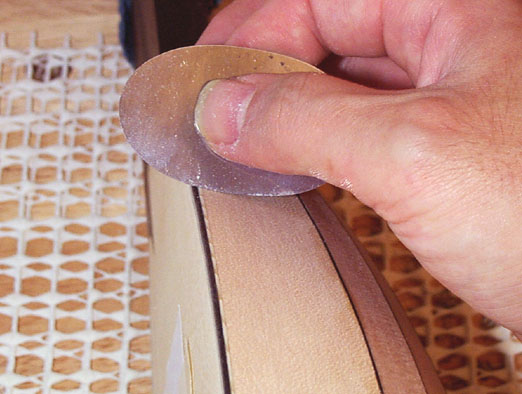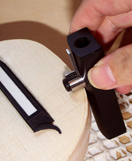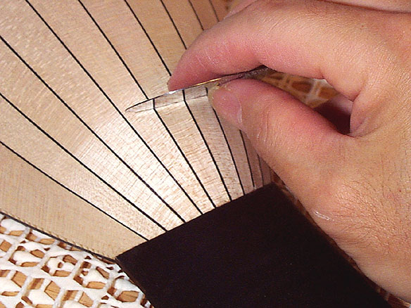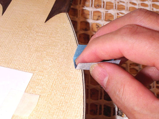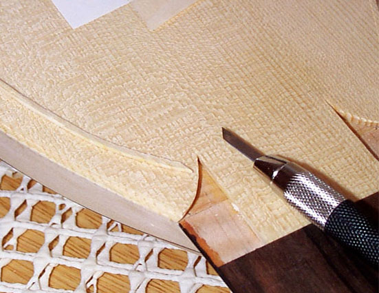 ギターのビンディングと異なり、リュートでは表面板の厚さがわからなくなるような太いビンディングはあまり用いません。作業の手始めはビンディングカッターを使ってのフチ切り作業からです。なおこの作業はデザインナイフのみを使ってもかまいません。とにかく木目に注意してください。