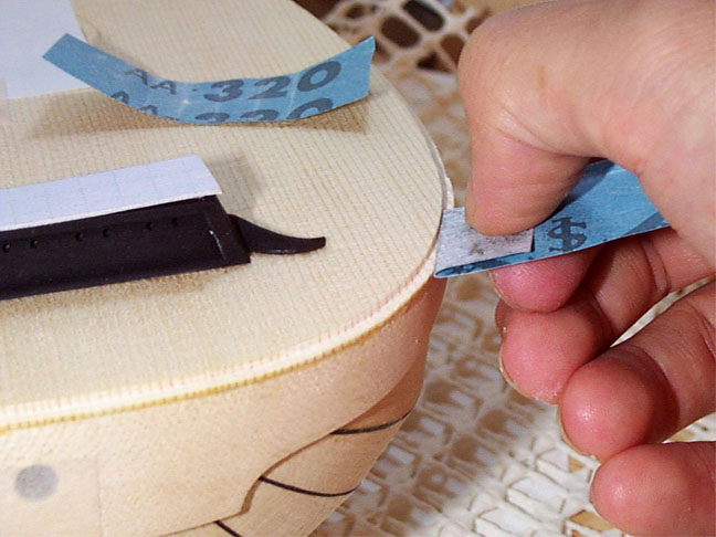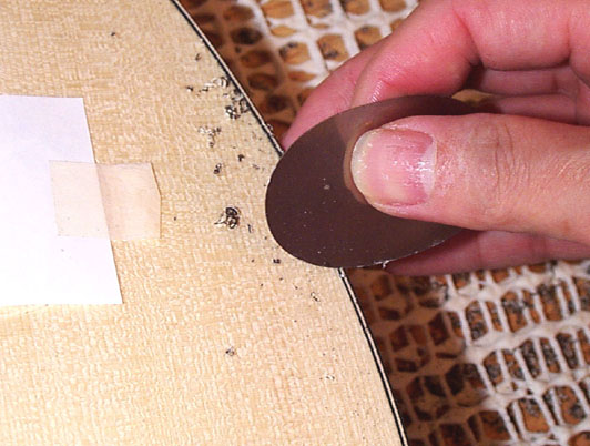 ここでアセってはいけません、きれいにしっかり接着するには接着面をなだらかにしておく必要があるのです。180番〜320番ぐらいのサンドペーパーで削ってならしていきます。それにしてもわかりやすい写真だなぁ(笑).....。