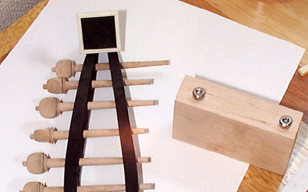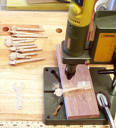 ハンドドリルまたはミニルーターでせん孔します。ルーターだとバリが出ずきれいに仕上がります。ビット(刃のこと)はかならずドリルを選びます切削用カッターではありません。せん孔するときはペグのテーパを考慮して小さな木片かつまようじを紙テープで土台に貼ってペグを傾けた状態で作業します。こうすれば穴はほぼ垂直に空きます。