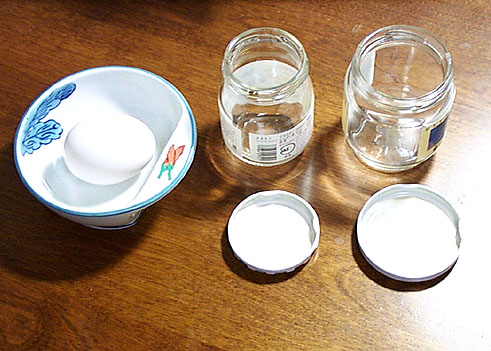 さあ、はじまりはじまり! お立ち会い! まずはタマゴ1個とジャムの空き瓶2個、そしてつまようじと容器などを準備します。布巾があればこすときに便利です。