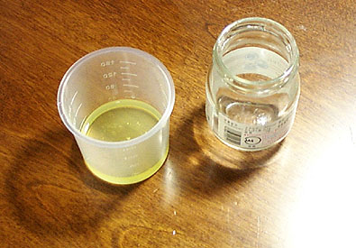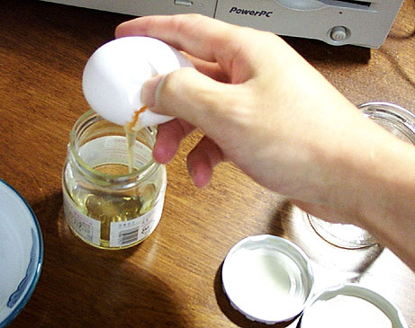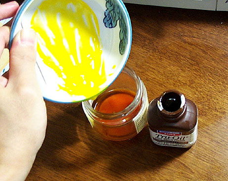 卵黄1に対してサンシックンドリンシードオイルを0.5の割合で別の瓶にて混ぜます。サンシックンドリンシードオイルは国内ではホルベインのほか(株)クサカベなどが画材店にて市販されています(粘度がやや異なる)。もちろんこのかわりにTru-Oilでもかまいません。はい、フタをしてよく振ってください。