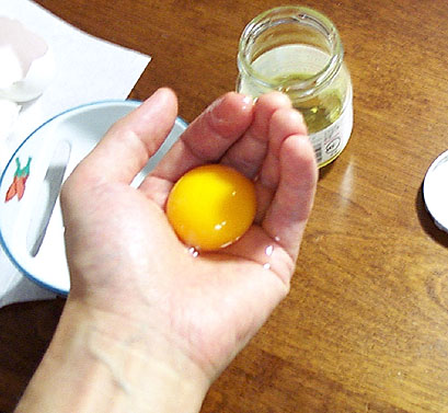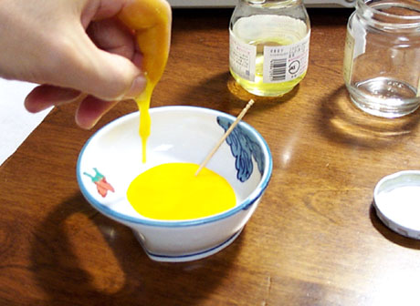 黄身はカラザを除去し、手のひらでころがして表面の白身をはがして瓶に入れます。右手と左手を交互にころがすのがコツです。家の人に見つかるとそのまま晩御飯のオムレツづくりを手伝うことになりますので作業の時間帯には注意が必要です。