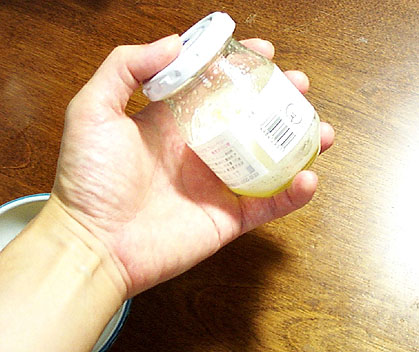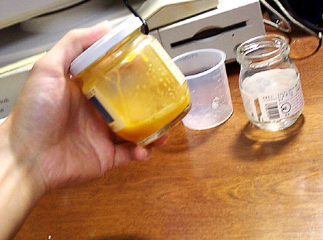 タマゴを割って白身だけをジャム瓶に移します。みなさんは片手でタマゴが割れます? ここでは左手にデジカメ、右手にタマゴというハイパーメディウム作り! (謎)