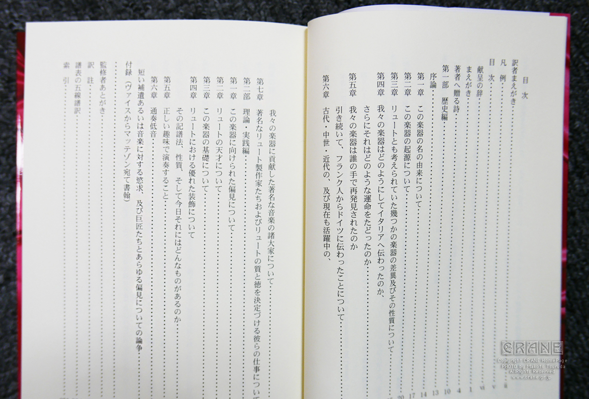 ● Ernst Gottlieb Baron の日本語版です。まさにこれこそ日本語で読めるヨロコビですな。歴史的な側面としてはリュートの名前の由来に始まり伝搬や著名な音楽家について記されています。また、後半は理論と実践について記譜法や性質などが述べられているほか、通奏低音や様々な論争、付録にはヴァイスからマッテゾン宛の手紙。そして、製作や楽器の装飾などについても書かれています。目次を掲載しておきます。