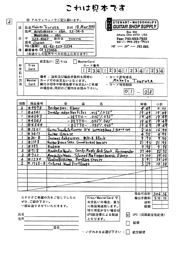 注文を直接インターネットのホームページ(国際的にはWebPageと呼ぶことも多いようです)上で商品番号やクレジットカードの番号を入力してオーダーフォームから送信してもいいのですが、セキュリティの心配があるという方もいらっしゃるでしょう(私も心配なのだ)。いくらSSLがかかっていてもIEのバグで心あたりのない請求が来ないとも限りません。たぶんそう思われる読者も多いであろうと考えてここではFAXでの注文方法をとりあげています(もちろん郵便で注文票を送ってもかまいません)。