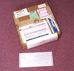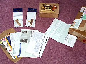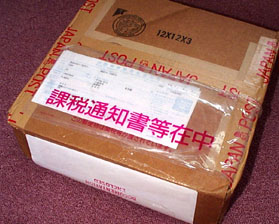 さて、それから1週間もしないうちにさっそく注文した荷物が届きました、さすがに$28の効果は大きいです。どれどれ...郵便屋さんが届けてくれたのですが、自宅で受け取ったときに関税700円を支払いました。国際宅急便EMSを使ってあるのが青白のシールでわかります。箱の裏を見ると課税通知書が入っています。あと、よく見ると「JAPAN POST」と書かれたガムテープが貼られているのがわかりますか?これは日本に届いた際に郵便局で課税検査・禁制品検査(輸入禁止品検査)がなされているわけです。つまりその中味が課税されるものかどうか、あるいは輸入が制限されている品目や麻薬や拳銃などといった危ないモノが密輸されていないか開封して中味を確認した証拠。箱の表にある緑色のシールがその承諾のしるしで送り主のWOODCRAFT社が貼ったものです。これは国際的な取り決めで日本から海外へ品物を送る場合にも同じ様な緑色のシールを書きます(輸送手段にもりますが)。正確には開封検査を行うのは大蔵省・税関職員であって郵便局員は介入しません。検査は企業の取引はもちろん、個人によって通信販売で送られてきた荷物ばかりではなく、個人対個人によるやり取りによるもの(例えば誕生日のプレゼントなど)でも実施されます。東京税関外郵出張所に尋ねてみたところ郵便物の場合、到着日時の翌日午前9:20より実施され、抜き打ち的に開封するのではなくほとんどの荷物を開封検査するそうです。あまり気持ちのいいものではありませんけど仕方ないですね....。