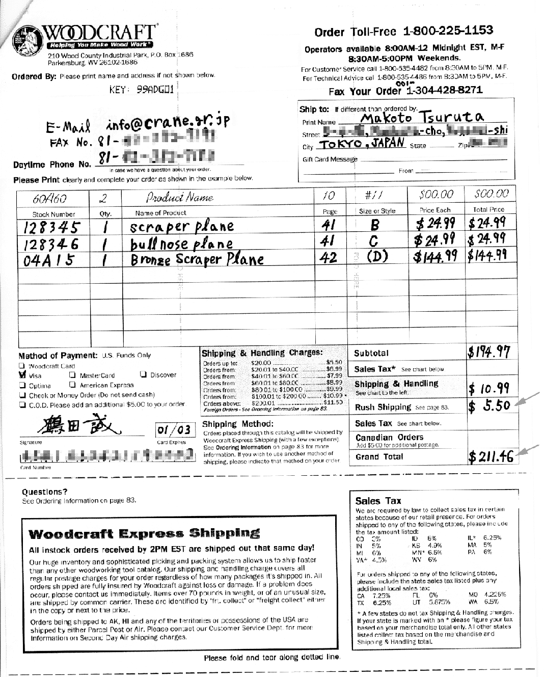 カタログの請求と入手についてはここではもう省略しますね。ここではもっと他にご紹介したいことがありますので....。さて、以下のように3つのカンナをFAXで注文しました。メールアドレスを記入する欄はありませんが、今後の交渉のことを考えて脇に書いておきました。とくに私は電話がかかってくるとあわてる(正直いって困る)のでなるべくメールで交渉したいところ....まあ、今まで国際電話で問い合わせがきたことはありませんが...。このFAXの内容を御覧いただければわかるとおり他社とほとんど同様の書式です。