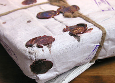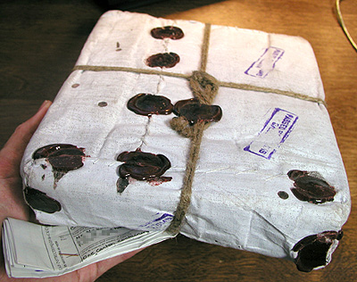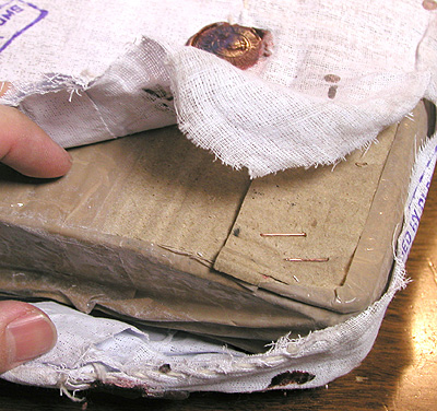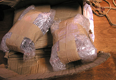 梱包のヒモは麻を編んだものです。包装してある布は石膏がひいてあるようで、はがすとパラパラと粉が舞い散ります。素晴らしい! これこそインドじゃ! インドじゃ! わたしゃミイラが出てくるんじゃないかとヒヤヒヤしながら荷物を解いていきます。送り主であるお店は輸送事情がわかっているらしく、ちゃんとEMS(国際郵便)で送ってきました。そうなんです、普通郵便だとどこに行っちゃうかわからないんですね、あはははははは!