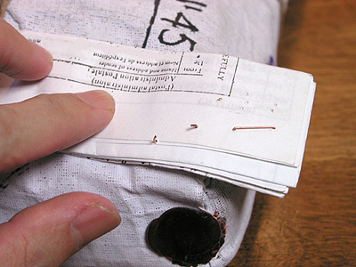 輸出に関する書類はこうやってホチキス(ステープル)で留めてありました。ところで、インドではホチキスで何でもかんでもバチバチ留める習慣があるようで、紙幣などもまとめてバチンとやるので現地のルピー紙幣にはその穴が空いたものが多いということです。梱包を解いていくと、お約束どおりしつこくホチキスが登場します(笑)。