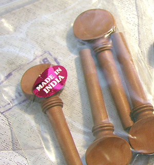 で、何を注文したのかというとヴァイオリンのペグです。Boxwood製で、どこにでもありそうなものですが、やはりインドから個人輸入するのは個人輸入のアコガレですから(笑)、あえてドイツやアメリカではなく、今回は実験的に難易度の高い国を選んでみたワケです。袋には誇らしく「MADE IN INDIA」の文字が燦然と輝いています!! インドじゃ! インドじゃ!