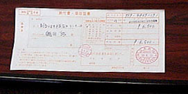 さて、書き終わった簡易申告書はすぐ隣のカウンターの「収納課許可係窓口」に提出します。しばらく待つと横長の小さな「納付書」をくれます。そこには国に納めるべき金額が書かれています。その金額は.......6500円! そうです、さきの国際配送会社がこの手続きをやると4万円なのです(25000円ぐらいで済むこともあるらしい)。こうやって自分で通関手続きをすればたったの6500円です。