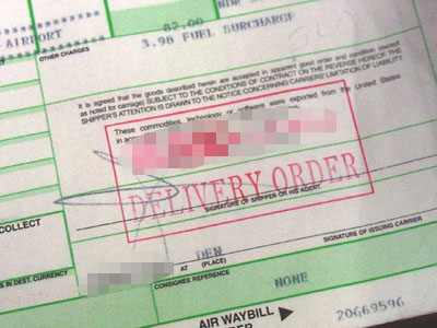 途中、都内で標識にまどわされて2回も道に迷う私(カーナビは積んでおらず、ふだん区内はまったく走らない).........なんとか日本橋から箱崎ICに乗って湾岸道路を走り東関道へ抜けます。遅れた分を取り返そうと、メルセデスにムチを入れて、時速100kmだと50分かかる東関道を30分で成田空港に到着(速度を計算してはいけません)。成田空港は広い....そのなかの「貨物地区」へと向かいます。この地区に車で入るには検問を受け、身分証明書を提示せねばなりません。検問を突破、おっと、順調に抜けて目指すは「貨物管理ビル」へ...このビルの中にいくつかの貿易会社の事務所が入っているわけです。車をビルの駐車場に停めてBG社の事務所へ(この時点ですでに2時をちょっと過ぎている)。さっそくBGの社員から書類を受け取り、急ぎ足でこのビルを出ます。受け取ったいくつかの書類のうち通関に必要な書類は2つ、「ビル(航空運送状)」と「デリバリー・オーダー」です。この会社のものは緑色の用紙ですが配送会社によって色や書式等は多少異なります。この「ビル」はビールのことではなく、ビル・ゲイツでもなく、ビル・クリントンでもありません。税関事務所で納税手続きのために必要です。「デリバリー・オーダー」は、いわば蔵出し依頼書のようなもので航空会社の倉庫から荷物を出してもらうために必要な書類です。よく見ると重量は5kgと記載されています。電話ではたしかに26kgと聞いていたのですが.....冷静に考えてみましょう......そりゃそうです、修復のために購入したボロボロでそれ以上壊れようのないギターをわざわざ木箱に組んで輸送するワケがないですね.....。