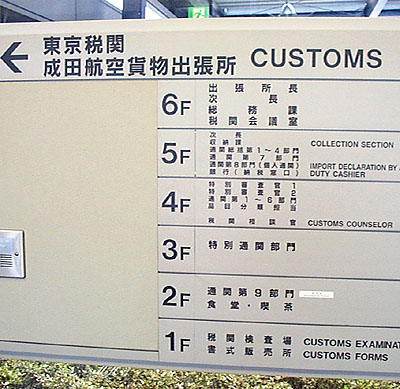 さて、書類を持って向かうのは税関事務所です。じつは歩いてすぐの場所に「成田空港合同庁舎」という、看板に一文字もひらがなの無い官庁ビルがあって、そのなかに検疫所(食品、植物、動物)や税関事務所がまとまって入っています。税関事務所は正確には「東京税関成田航空貨物出張所」といい、この庁舎ビルのいくつかのフロアに部署が分かれており、私のような個人輸入の手続きは5階の「通関第8部門」という部署になります。エレベーターを上がって5階の入口を入ったすぐ目の前に受付があり、数名のお客さんと大勢の職員が忙しそうに働いています。ここのみなさんは公務員ですので胸には税関職員のバッジを付けて働いています。どうせなら検疫や荷物検査の現場を見学しておきたかったなぁ....。