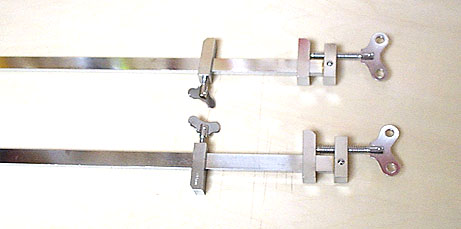 上の写真では上下に2本を並べた写真のうち、上に写っているのがオリジナルの状態、そして下に写っているのが鶴田改造モノ....。え? どこが違うのかって? 固定側のネジが逆向きになっているのがわかるでしょう。こうすることで作業が楽になるのです。支柱の終端のストッパーを削って入れ替えるだけですが、これはスチール製でズッシリ重いということもあって作業時も安定します。表面板や裏板のブックマッチで活躍します。なかなか重宝するので私は3本持っています。一度に何本も同時に楽器を作るわけではないので3本で充分なのです。