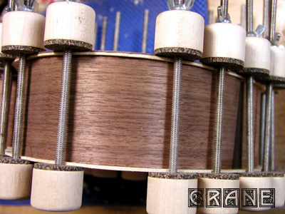 御覧のとおり単純なつくりなので自作もできます。でも6本で2000円ぐらいなので.....買ったほうがいいかなぁ(笑)。側面板と上下ブロックができてライニングを付け、そのあとの箱にする作業で活躍します。ゴムバンドやヒモでもかまいませんが私はこれに慣れちゃいました。時々シャフトに付着した接着剤や膠を掃除しないと蝶ネジがスムーズに回転しません。ちゃんとメンテするべし。クレーン推奨品★★★
