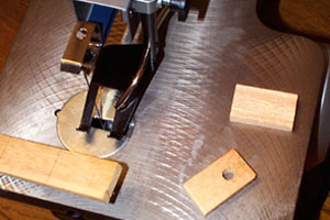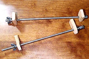 弦楽器のボディと表面板を圧着・固定するためのクランプ(スプールクランプ)というものも市販されてはいますが、これは自作品です。木片をボルトと蝶ナットで締め付けるという至ってシンプルな構造。ギターやヴァイオリン製作のみに使うのであれば丸棒の円筒形(ちくわみたいに....)の木片で製作してください。上の写真のクランプはバロックギターのように裏板がラウンドしている楽器製作にも使えるようにと考えたもので、軸ボルトに対して木片が若干傾斜するようになっています。つまりボルト軸と木片の穴の隙間によってクランプしたときに傾きが生ずるわけです。
