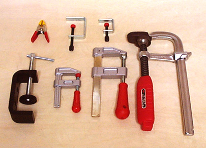 クランプはD.I.Yのお店でいくつかの種類をみつけることができるでしょう。当然のことながら楽器専用などというものは店頭にはありません。私(鶴田)の場合はこの写真で紹介しているクランプはすべて近所のD.I.Yのお店で入手したものです。上の写真のいちばん右側の大きなクランプ(Lクランプ)は3本もあれば充分です。
