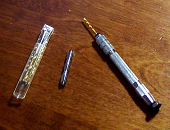例えばブリッジを接着してしまったりすでに弾いてきた楽器の状態が変化して弦高が著しく低く(または高く)なった場合などにブリッジをはがさずに穴を空けたりできます。もしルータをお持ちであればオプション(ドレメルもプロクソンも)で市販されている「フレキシブルジョイント」を使ってもいいのですが、ちょっと高価ですので、小市民としては手作業でグリグリとこのツールのお世話になるわけです。
