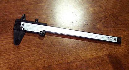 これも定番ツールですね。楽器作りでは計る場所がやまほどありますからぜひ1本は常備したいところ。マグネスケールという磁性体の目盛テープを使ったディジタルノギスというものもありますが高価なのでこの写真のような昔ながらのノギスが1本あれば充分です。ところでみなさんノギスの読み方はわかりますよね?