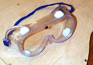 下の写真のゴーグルは一見曇らないようにアイディアが凝らされているようですが、じつはしっかり曇ります。このテのゴーグルは種類も多いのですが、たいていは間違いなく曇ります。飛散する材料片よりも曇って手元が狂うほうがはるかに危険だと私は考えています。