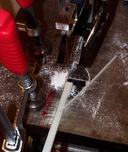 ・糸のこ盤でまっすぐに材料を切断するには定規をクランプでノコテーブルに固定してガイドとして使えばうまくいきます。