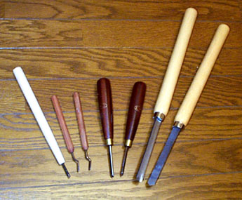 ちなみに、木工旋盤では私は以下のようなバイトやノミを準備して一式を研いでから作業に入りますが、実際には使用する刃物は3〜4本に限られてきますのでみなさんはこんなに揃える必要はありません。右端の太鼓のバチみたいな2本は購入した木工旋盤に付属してきたもので(デカイ!)、お茶碗やお盆、イスの脚やテーブルの脚、こけしや燭台なども作れますよ〜〜〜ん。