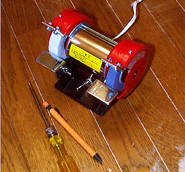 グラインダは私はほとんど使いませんが、あればナットやサドルの加工が能率良く作業できます。これは「ちょ〜ミニ」ですがけっこうウルサイというところは一人前。使用にあたって注意すべきは「ダスト」そうです、粉じんです。気が付かないうちに大量に吸い込んでいます。防塵マスク着用のほうがいいでしょう。木ペグの加工にグラインダを使うプロもおられます。