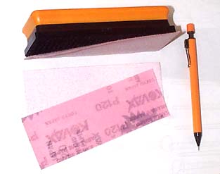 ところで......紙ヤスリをかける作業をブロックを使わず紙だけで長時間おこなうと指がツリます(笑)。そればかりでなく平らな面がデコボコに....。そこで登場するのが下の写真のマジックサンダー....そう! あのサンダー杉山の考案したという..........(ウソ)。