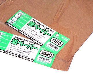 ・ハンドサンダー用替ペーパー:ムラウチホビー八王子 藤原産業(株)#80、#120 どちらも330円 ベースとなる特殊な布地に砥粒が並んでおり目詰まりしにくいのが特徴。但し、サンディング時には少し傾けてブロックに貼ったほうがいいです。とにかくガンガン削るときはこれに限ります。