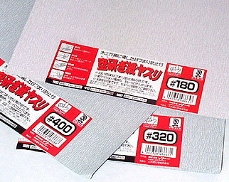 以下の写真にある、いわゆる通常の工作用「茶色い紙ヤスリ」は木目に沿った1方向にかければけっこう使えるのですが目詰まりしやすく寿命も極端に短いので不要です。
