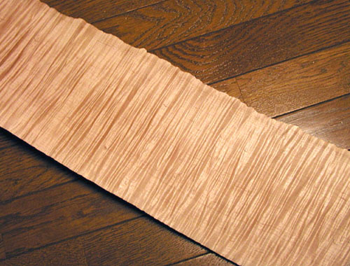 しかし....こんな感じ(以下の写真:水で濡らしてません、乾燥状態で撮影)のメイプル板材などは杢部分でカンナの刃がひっかかりがちになり、よほど慎重に作業してがんばらないとなめらかに仕上げるのは困難です。ちなみにこの材は「もくもく」にて分厚いランバー(ものすごく高価だったんだぞ〜〜!)から約5mmの厚さに挽いてもらったもので約10枚とれました。