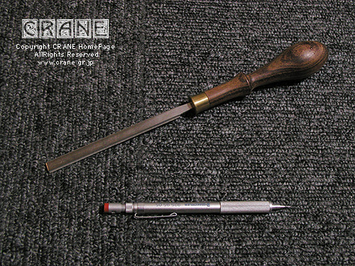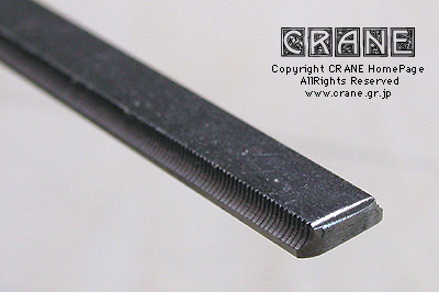 これはフレット先端部のエッジ処理に使うヤスリですが、1/4湾曲面の溝を持つ構造から、フレット高さに影響を与えず指板も傷付けにくいところが気に入っています。しかし、ちょっと油断するとフレットの両端部(1弦側と6弦側)を過渡に削ってしまうので用心しながら平行に作業せねばなりません。私の場合はバーフレットを使うことがほとんどなので、最初のバリ取りには重宝します。欠点としては12フレット以上の高音域では使いにくい(フラッシュフィンガーボードの楽器では使えない)という点でしょう。だいぶ前にStewMacで購入しましたが、何年経っても切れ味はさほど変わらず、丈夫で長持ちしています。