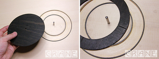 ちなみに表面板はブレイスの1本づつを曲げねばならず非常に面倒。高さも上が高くて下が低いように傾斜をつけて削っておきます。ロゼッタは以下の写真のように1枚の黒檀板をドーナツ状に切り抜いて、それをあらかじめ彫っておいたロゼッタ溝にハメコミます。単純そうに見えるでしょ? でも難しくてピッタリ合わせるのに四苦八苦。手順を変えればもっとらくにできたのですが、とにかく一段落。