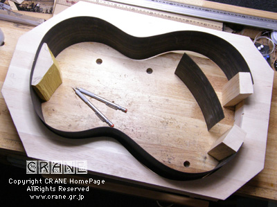 13フレット以上では指板が表面板から浮きます。といってもスプルースと黒檀の薄板が敷かれる構造です。ちょうどフレットの位置に黒檀帯が来るようにまえもって工作しておきます。浮かしたいんだけどフレット部分は密着させたい、これがCRANEのセミフロート指板という概念なのさ。やっぱ、天才製作家のやることは違う。これで音が良くなるとも思えないが......。
